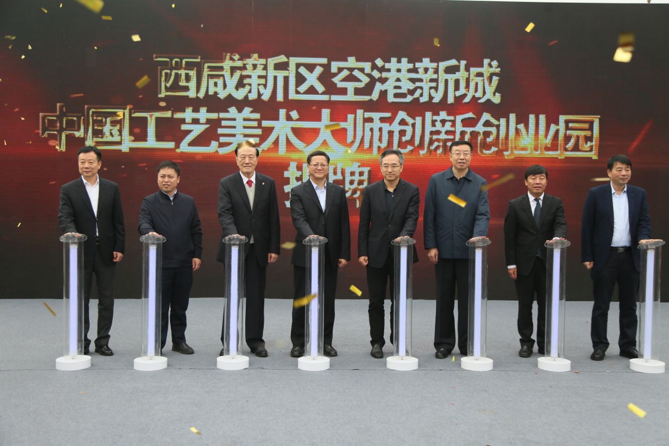 上午10点整,揭牌仪式在空港新城省级非遗项目秦汉战鼓的演出中正式开始。陕西省委宣传部副部长李彬,西咸新区党工委副书记、管委会主任康军,咸阳市政协主席贺书田,原全国人大常委会委员、国家轻工业部副部长陈士能,陕西省文化和旅游厅副厅长陈梦榆,西安市委宣传部副部长廉宏伟,西安市文化和旅游局副局长马立军,西咸新区党工委委员、空港新城党委书记、管委会主任贺键,共同为中国工艺美术大师文化创新创业园揭牌。