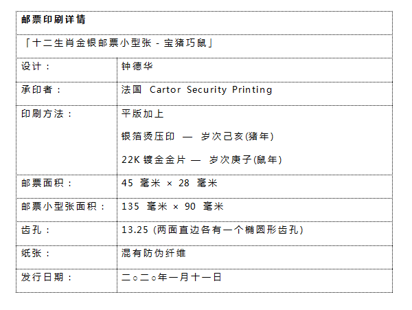 十二生肖金银邮票小型张-宝猪巧鼠发售时间:2020年1月11日